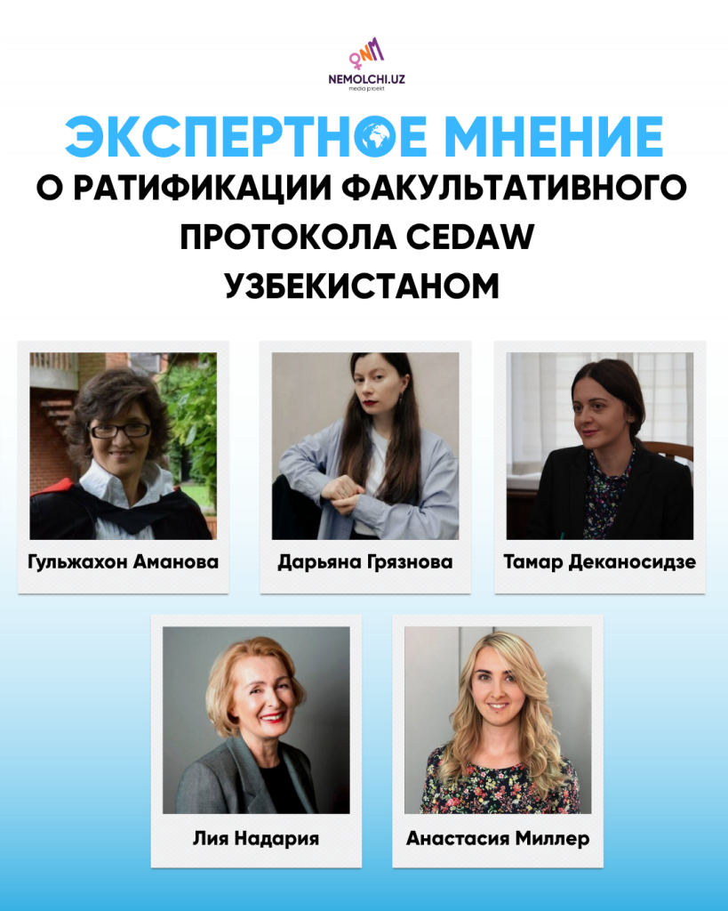 Редакция Nemolchi.uz убеждена, что ратификация Факультативного протокола к CEDAW укрепит приверженность Узбекистана защите прав женщин, усилит позиции на международной арене и обеспечит дополнительные механизмы защиты и правосудия узбекистанкам.